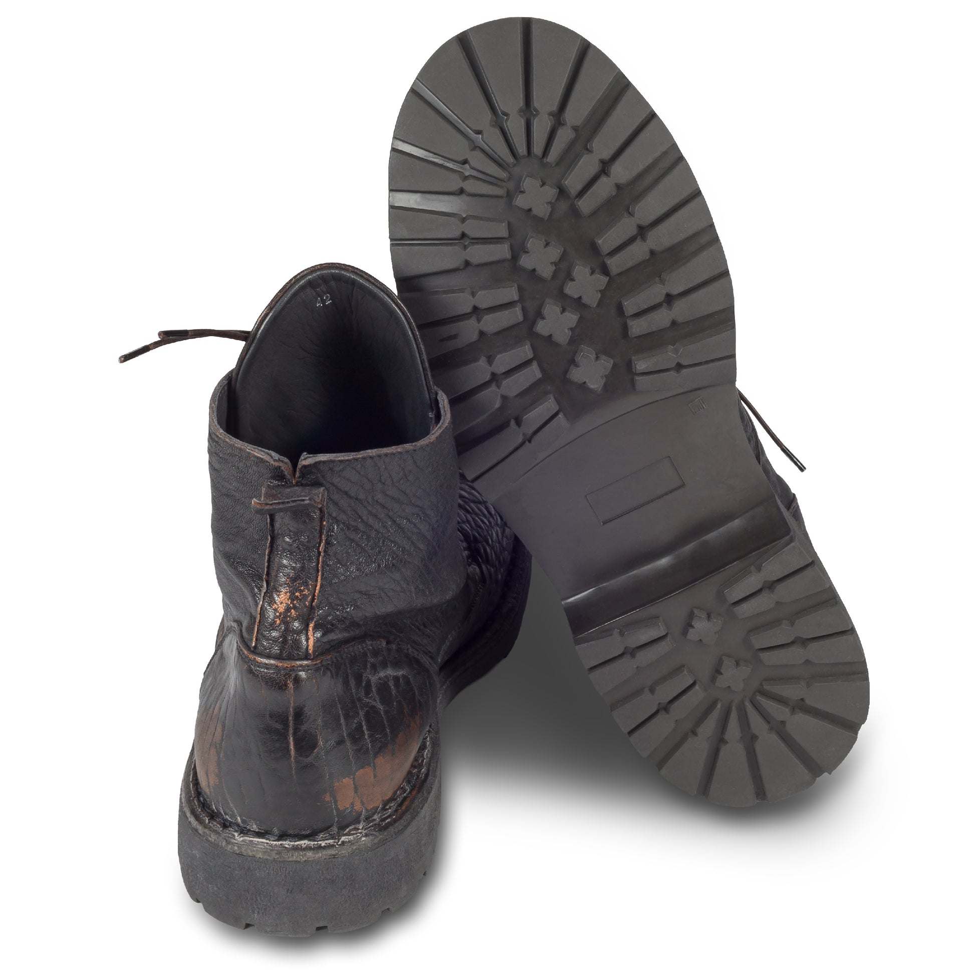 Ausgefallene, lässige Herren Stiefeletten aus Kalbsleder von MOMA! Das Leder wurde aufwändig bearbeitet, um diese einzigartige Struktur zu erhalten. Anschließend wurden die Boots zweifarbig in schwarz mit dunkel braun coloriert und auf den gewollten used-Look bearbeitet. Jedes Paar ist dadurch einzigartig und eine leichte Abweichung vom Original zu den Produktbildern ist ein gewolltes Merkmal der Individualität.